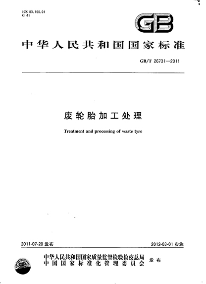 2012月3月,公司為主要起草單位的國家標(biāo)準(zhǔn)《廢輪胎加工處理》標(biāo)準(zhǔn)號:GB/T26731-2011,正式頒布實施