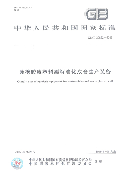 2016年11月1日,公司為第一起草單位的國家標準《廢橡膠廢塑料裂解油化成套生產(chǎn)裝備》標準號:GB/T 32662-2016,正式頒布實施